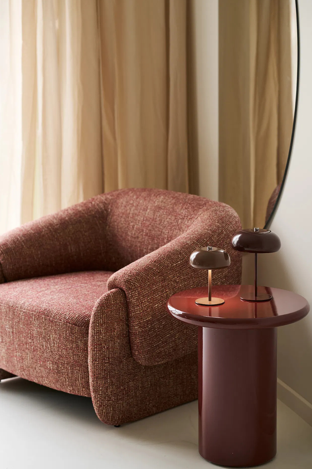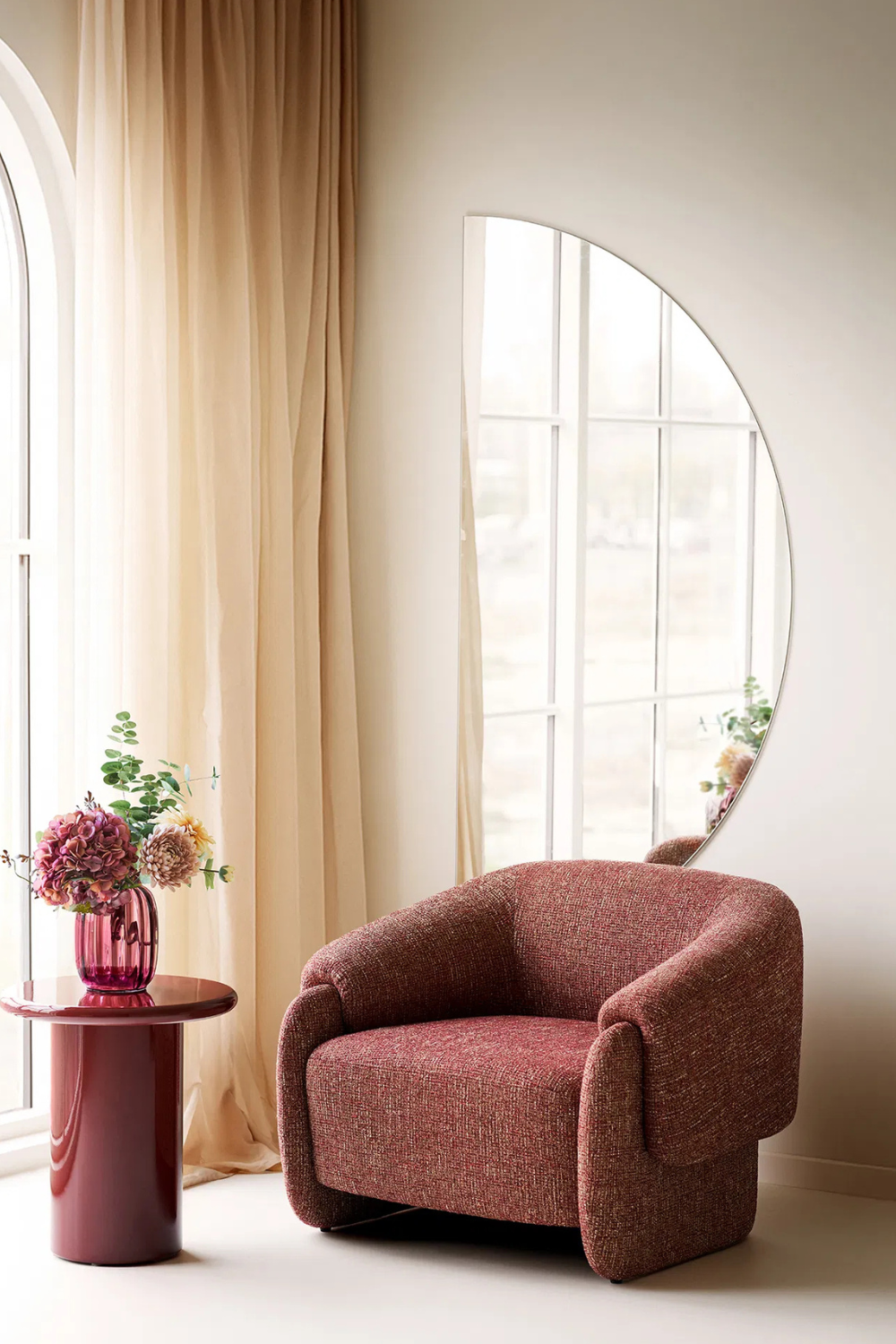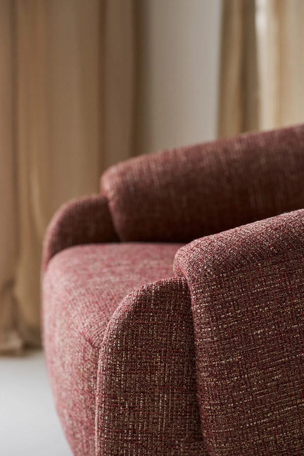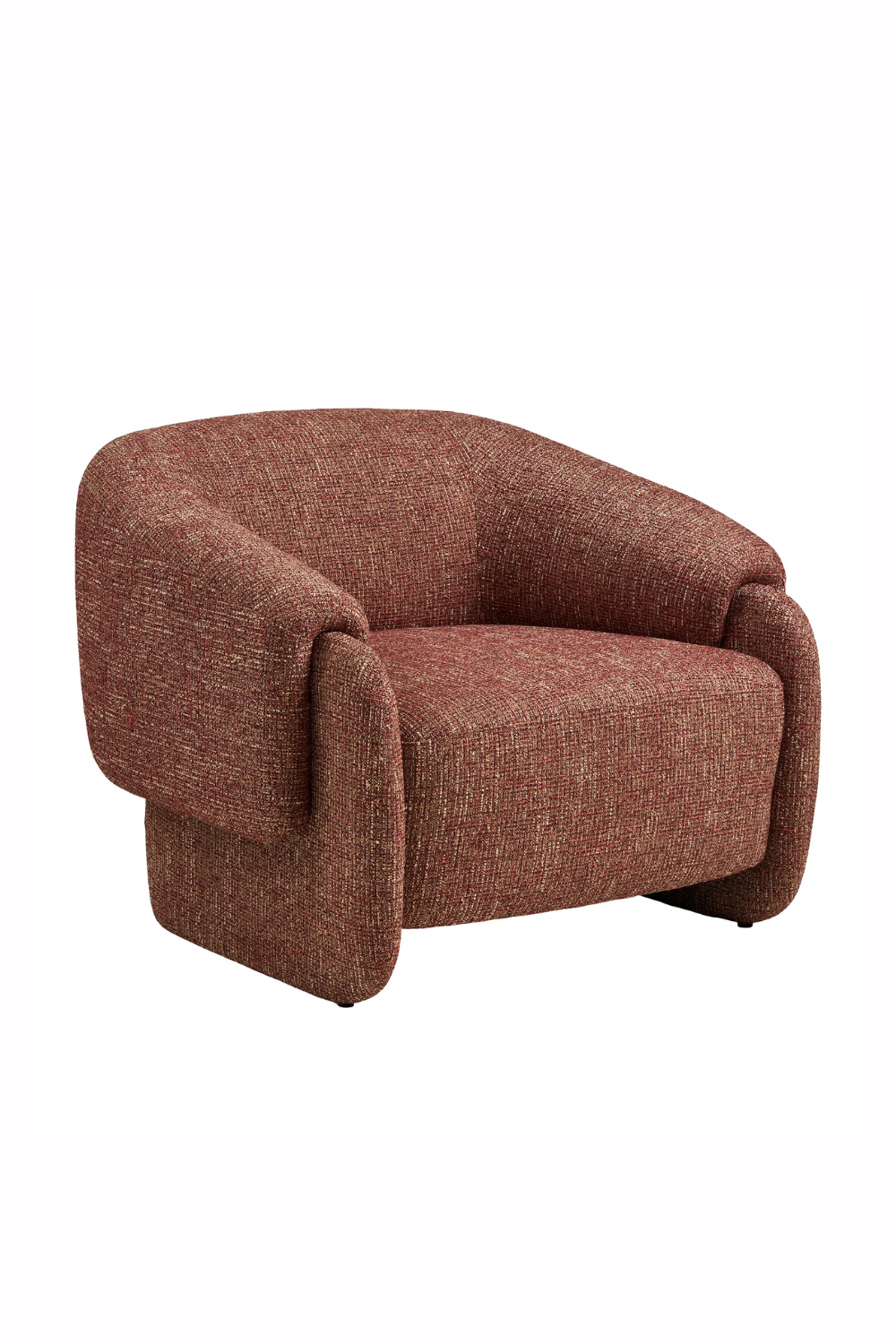 En inbjudande loungefåtölj i bordeauxfärgad melerad textil med rundade, mjuka former.En elegant statement-piece som tillför djup, värme och en exklusiv känsla till rummet.