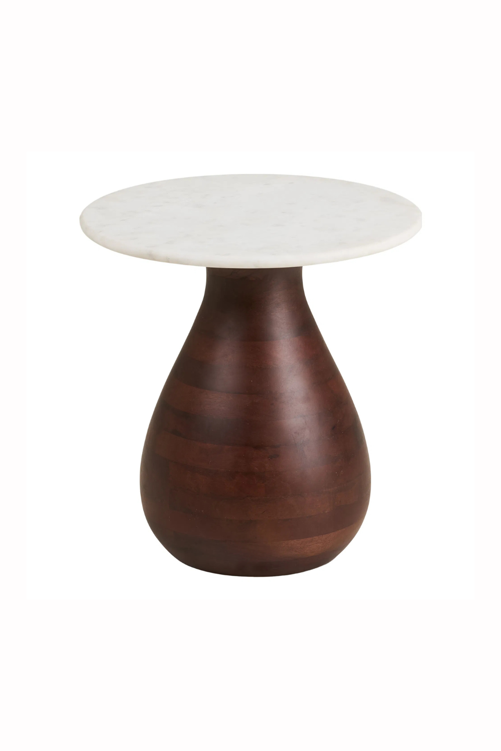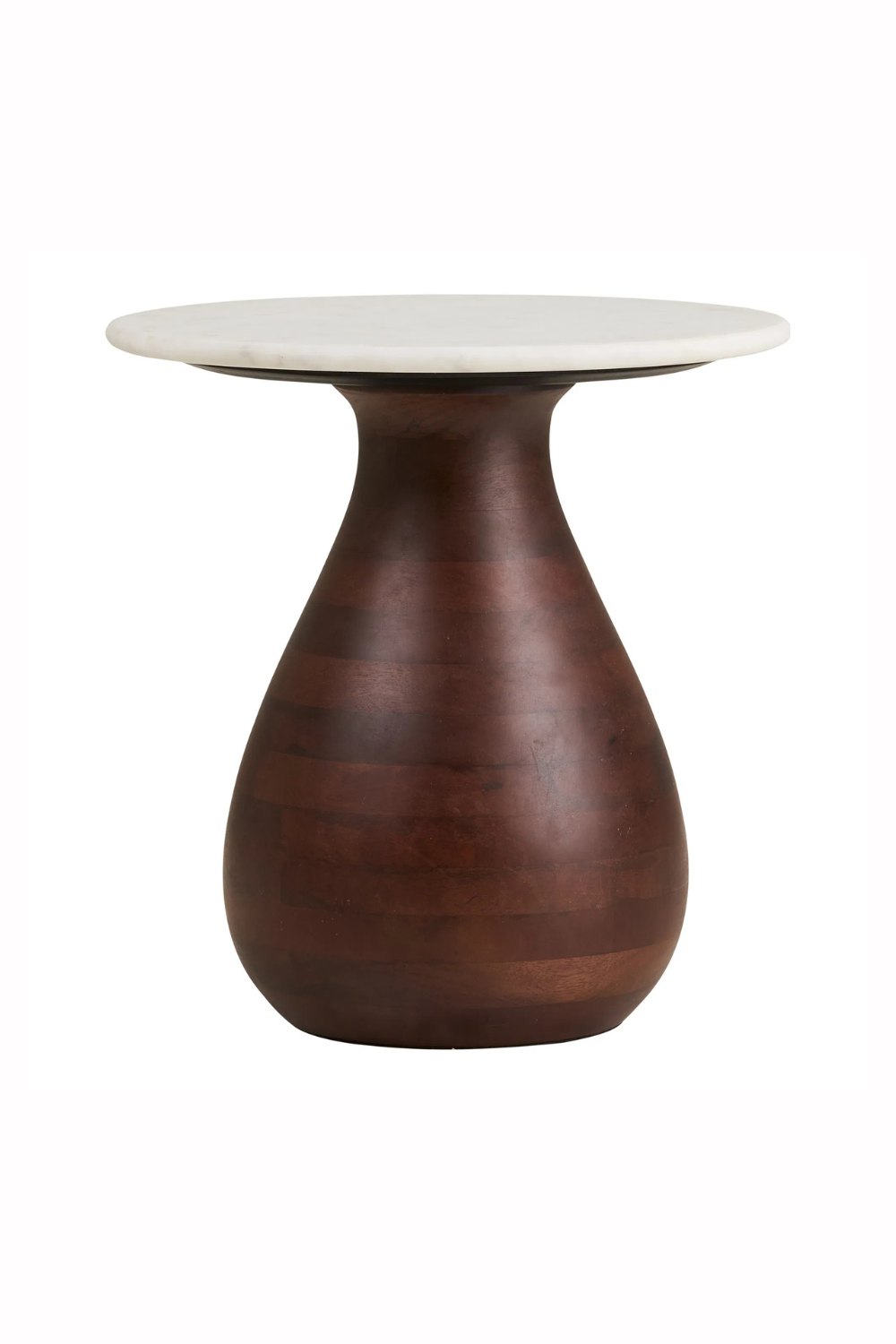 Ett karaktärsfullt sidobord i mörkbetsat mangoträ med topp i vit marmor. Den mjukt avsmalnande formen skapar en balanserad siluett med naturlig tyngd.