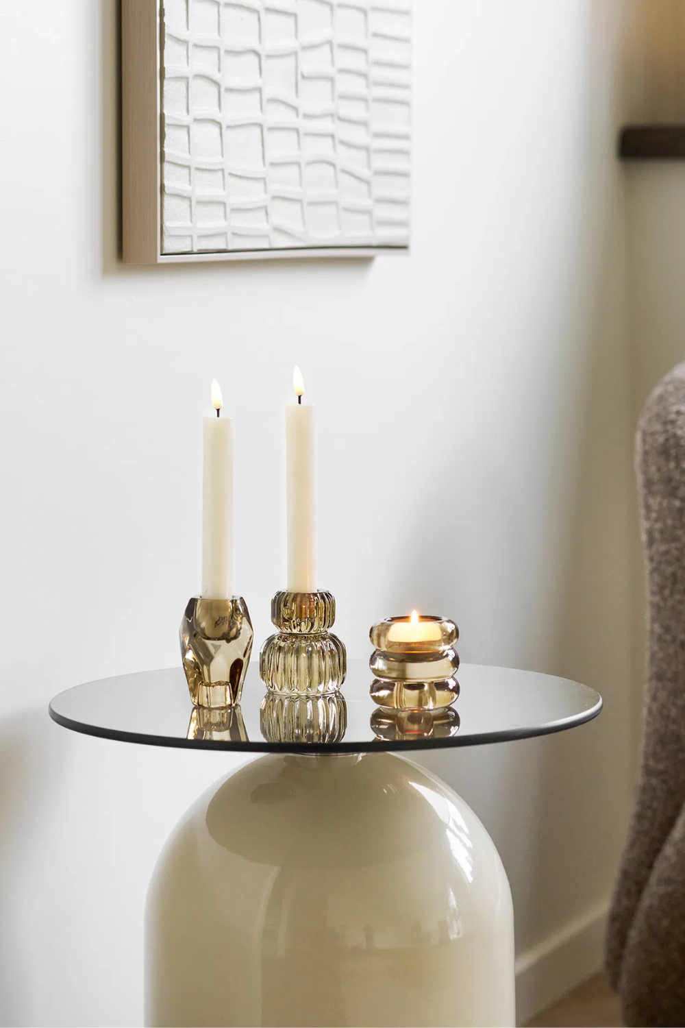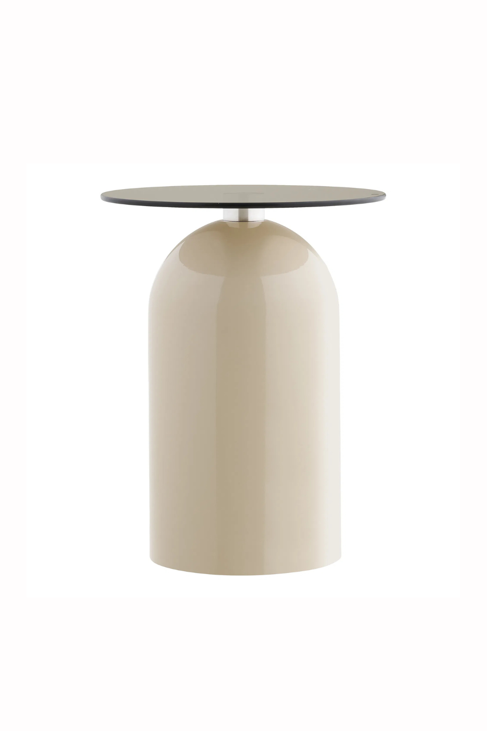 Ravello sidobord förenar mjuka former med ett modernt uttryck. Den beige metallbasen ger en stabil och skulptural känsla, medan den grå bordsskivan i härdat glas skapar en elegant och luftig kontrast. Perfekt bredvid soffan eller som ett stilrent accentbord, där design och funktion möts i harmonisk balans.