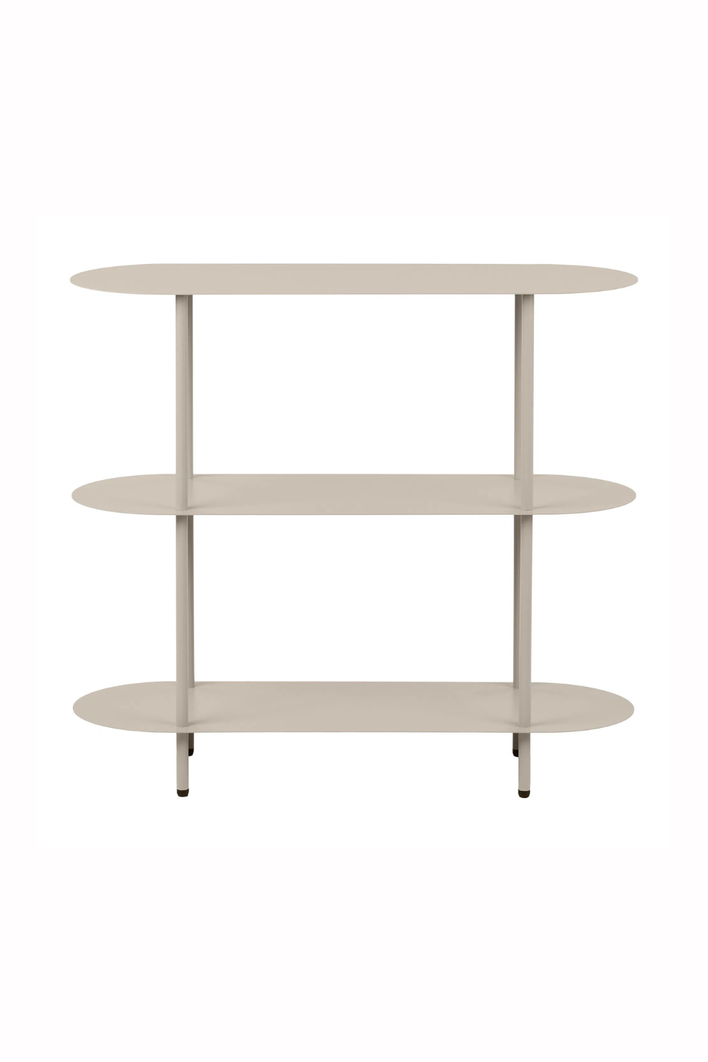 Stilren hylla i sandfärgad metall med mjukt rundade hyllplan. Den öppna designen ger ett lätt uttryck och passar perfekt för böcker, växter och dekorativa föremål i vardagsrum eller hall.