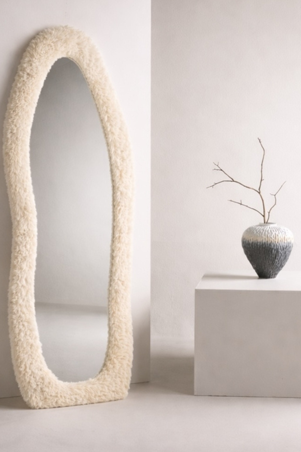 Mirza är en spegel som verkligen sticker ut. Den mjuka ramen i beige fuskpäls ger ett lekfullt och modernt uttryck som tillför värme och karaktär till rummet.Den organiska formen skapar ett harmoniskt intryck och gör att spegeln känns både inbjudande och unik. Perfekt i sovrummet, hallen eller som en trendig detalj i vardagsrummet – Mirza lyfter varje miljö med sin charmiga personlighet.