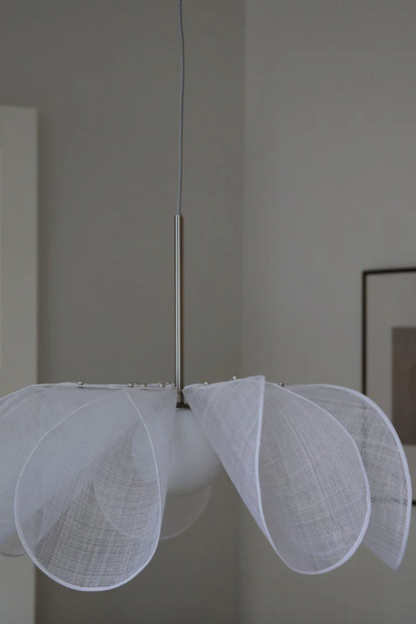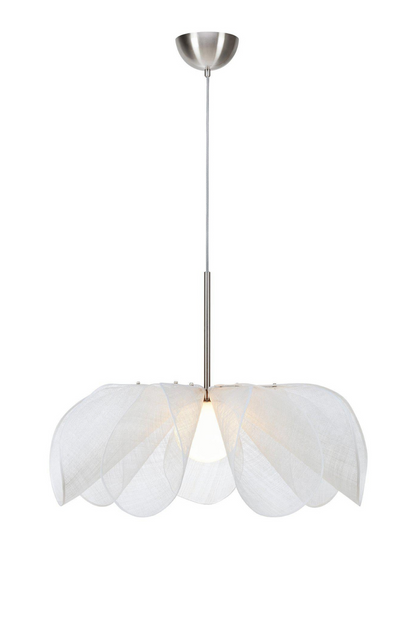Der blumenförmige Schirm aus Bananenfaser sorgt für eine wunderschöne Beleuchtung und die nickelfarbenen Metalldetails verleihen einen modernen Touch. Die Lampe hat einen Durchmesser von 75 cm und passt perfekt ins Schlafzimmer, Wohnzimmer oder über den Esstisch.