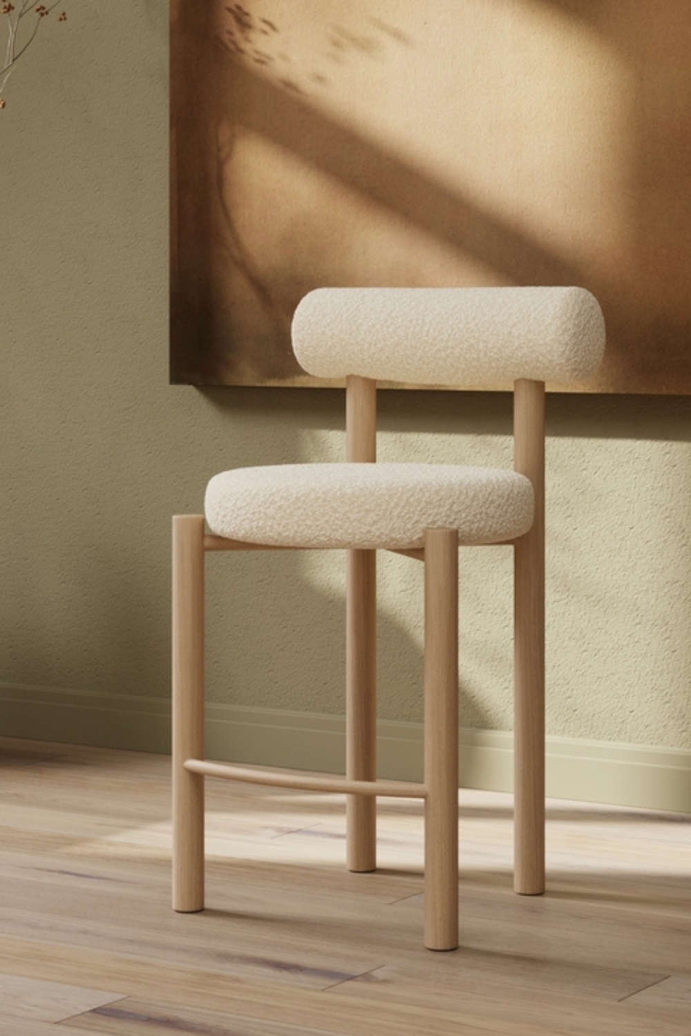 Tillo är en stilren barstol som kombinerar rundade former med en mjuk sits i vit bouclé. Den enkla men genomtänkta designen ger ett modernt uttryck som passar perfekt vid köksön eller barbordet.