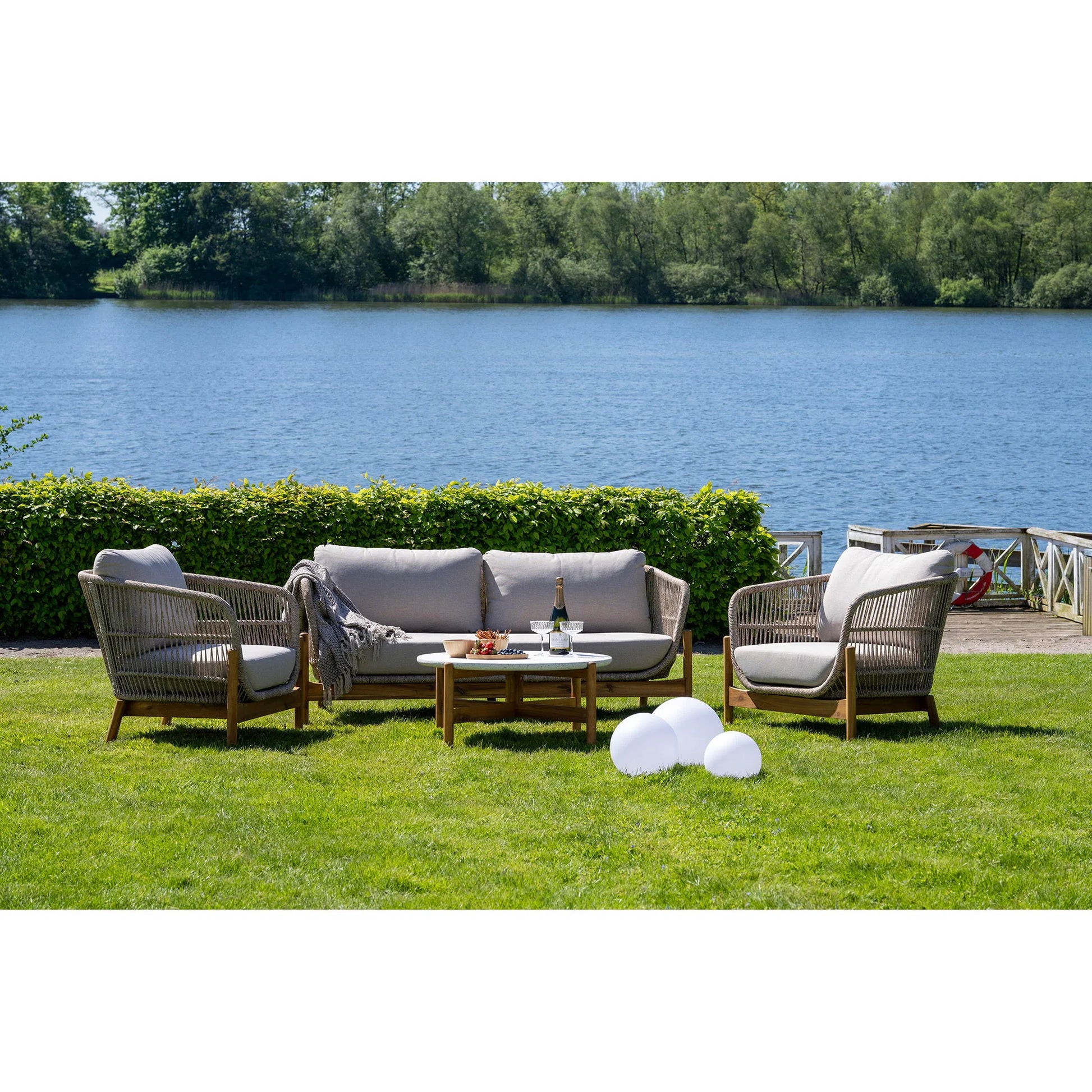 The series is built with a sturdy frame in FSC-certified acacia, whose warm wood tones are softly contrasted by hand-woven rope details and cushioned cushions in sand beige polyester. The generous seating surface and soft foam-filled cushions invite you to relax in harmony with nature. The table is made of durable, hard-wearing and stylish terrazzo adapted for outdoor use.