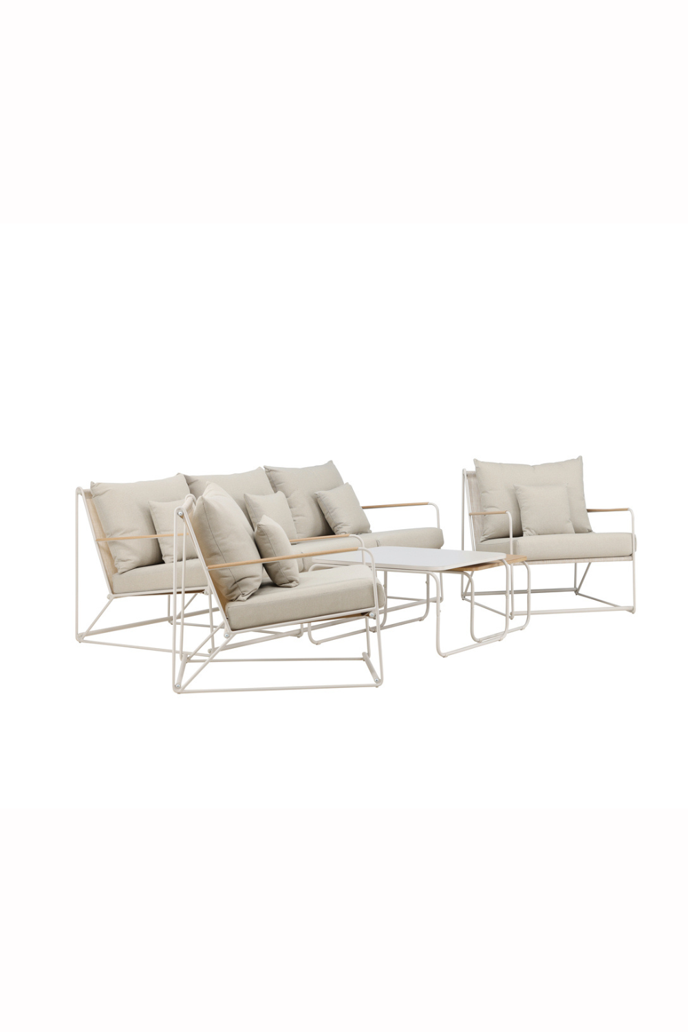 The Palazzo sofa set is an elegant and stylish outdoor furniture set that gives your patio a luxurious feel. With two comfortable armchairs, a spacious sofa and a matching table, this set is designed to create an inviting place to socialize and enjoy warm summer days. The sturdy beige steel frame provides stability and a modern touch, while the cushions in a soft beige shade add both comfort and aesthetics. The cushions are made of durable textile and polyester, making them perfect for outdoor use and easy to maintain. The Palazzo sofa set combines form and function in a way that will lift your patio to new heights.