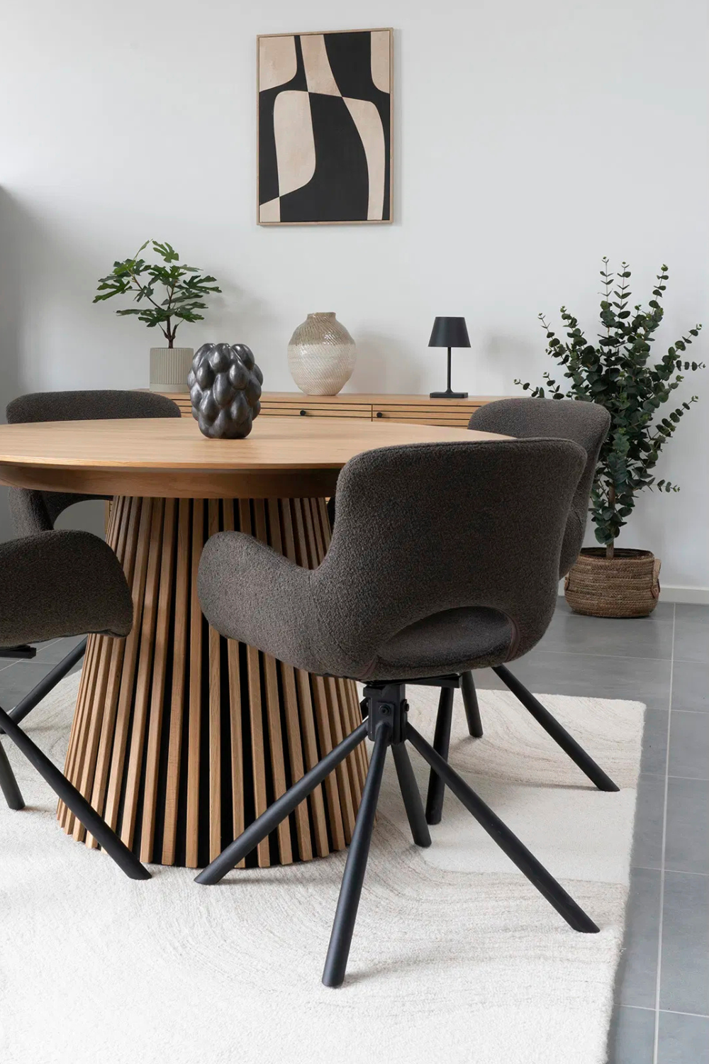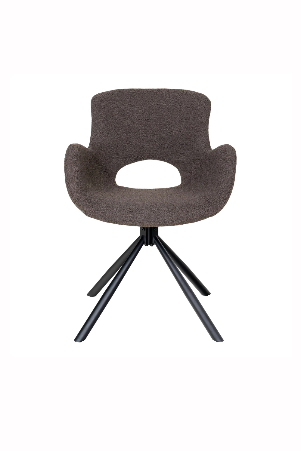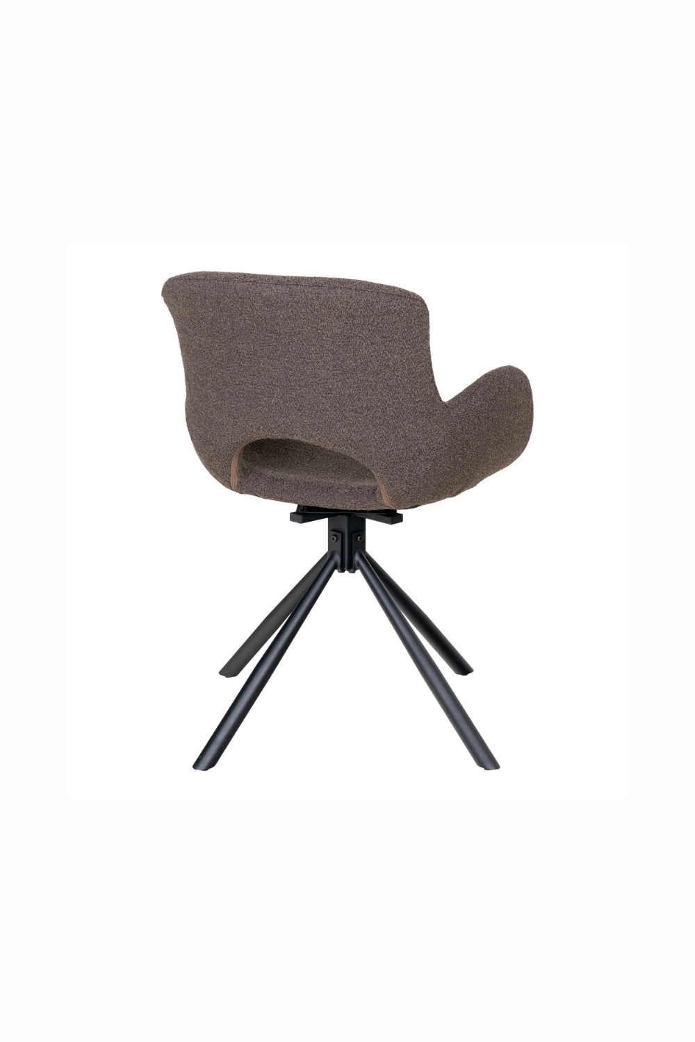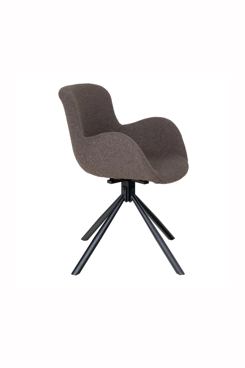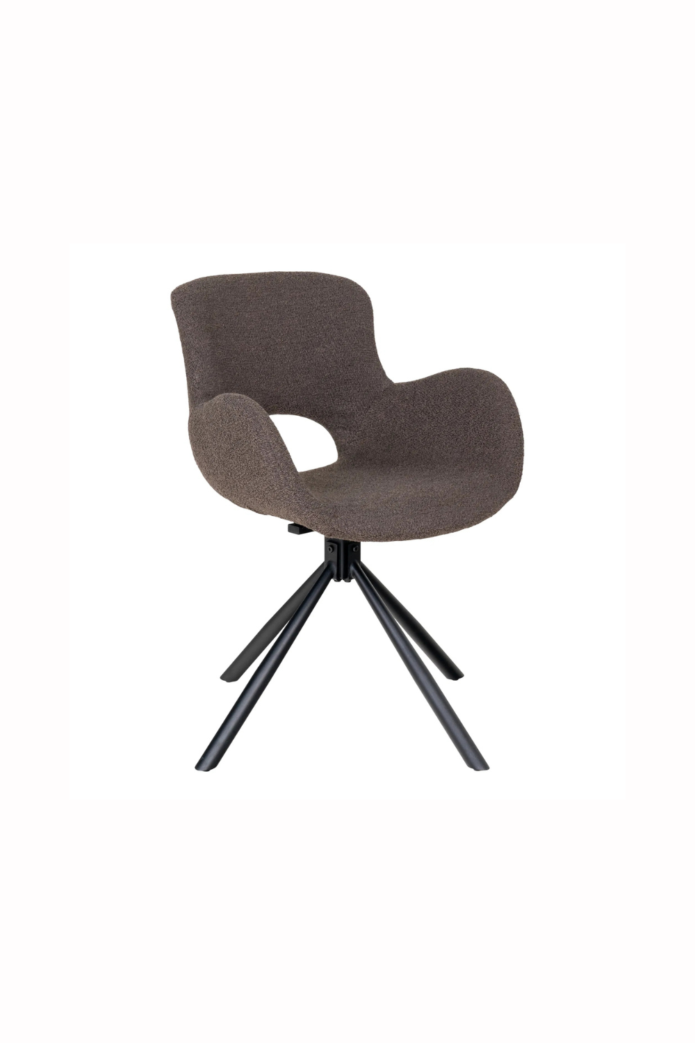 Snurrbar stol klädd i mjuk bouclé i färgen mushroom. De organiska linjerna och den omslutande sitsen ger hög komfort och modern elegans, medan det svarta metallunderredet skapar en stilren kontrast.