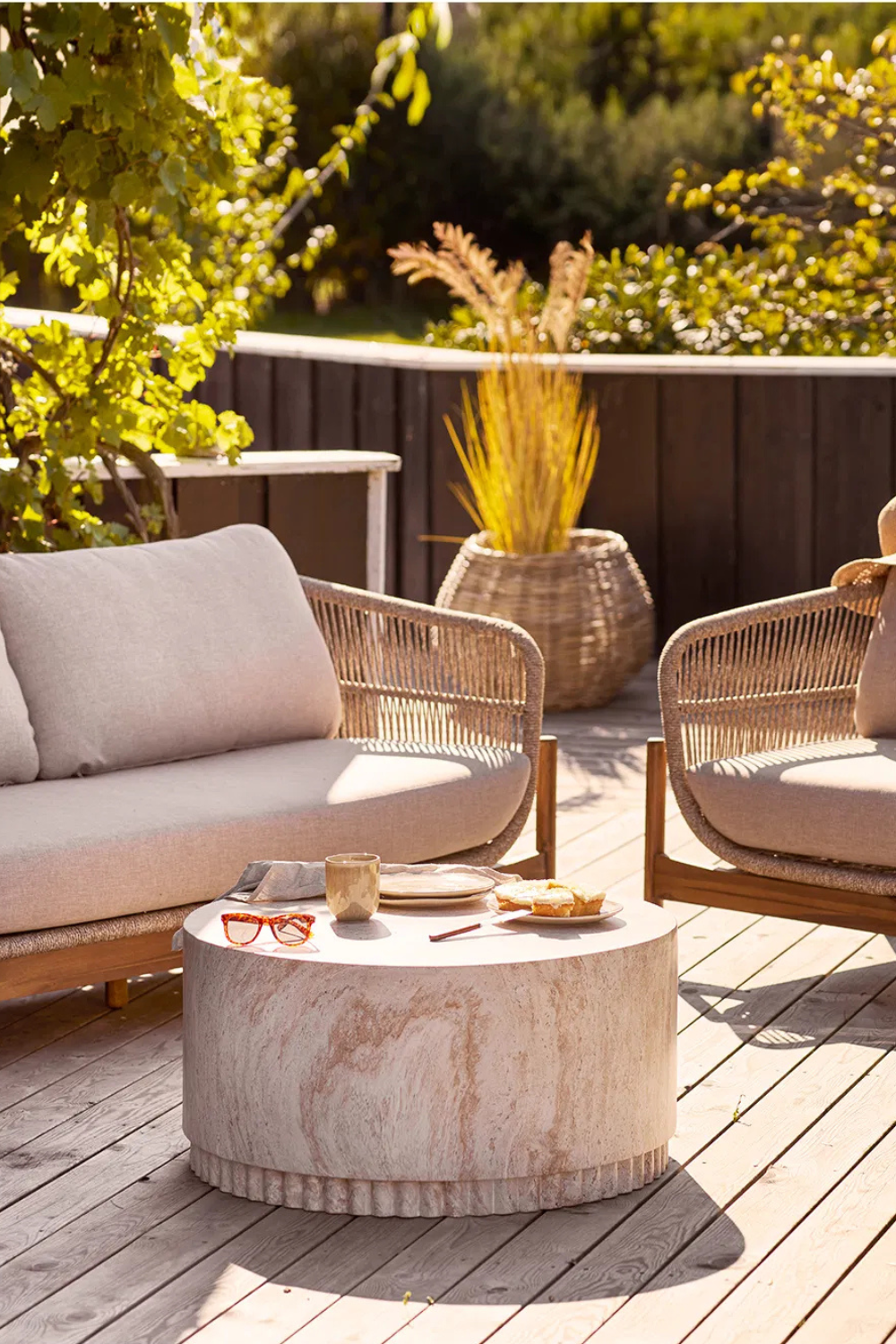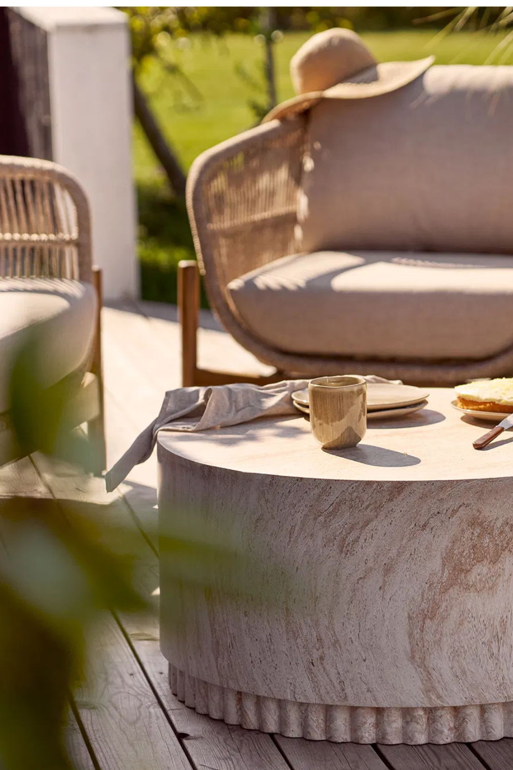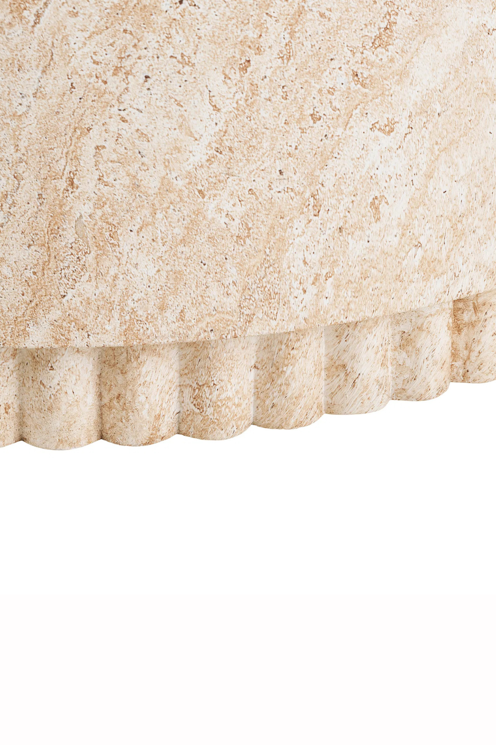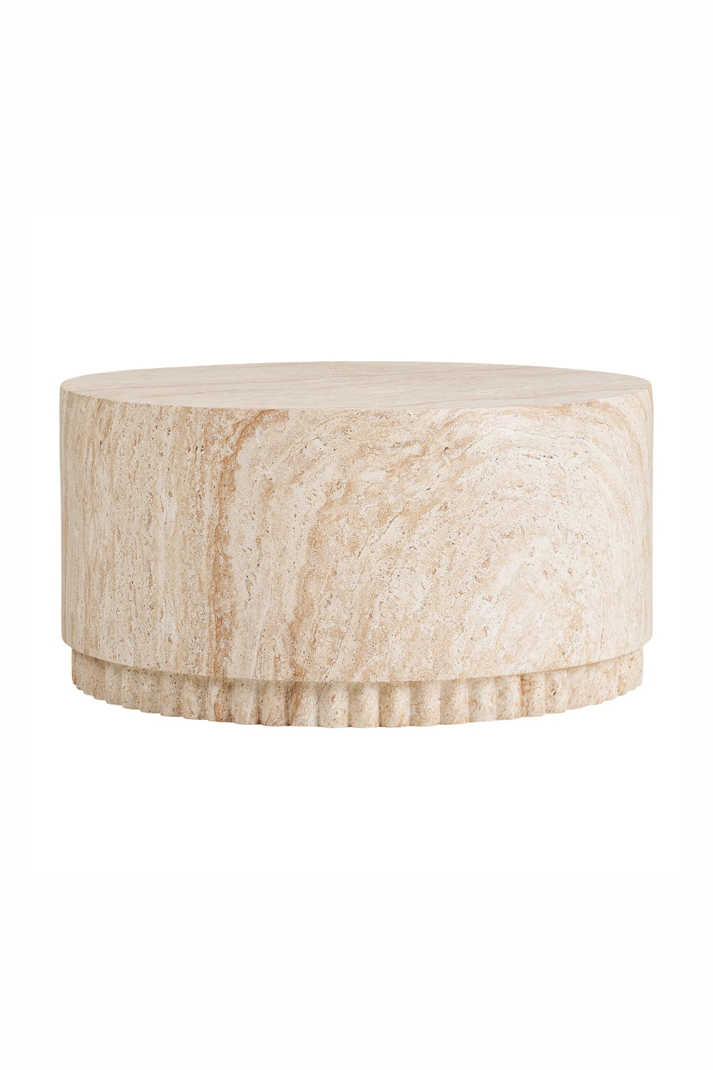 Soffbord i fiberclay med naturlig finish och dekorativ räfflad bas. Den runda, stabila formen ger struktur och en elegant känsla till uteplatsen