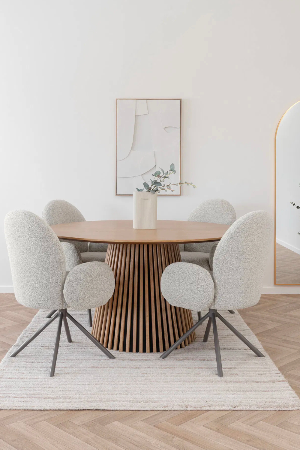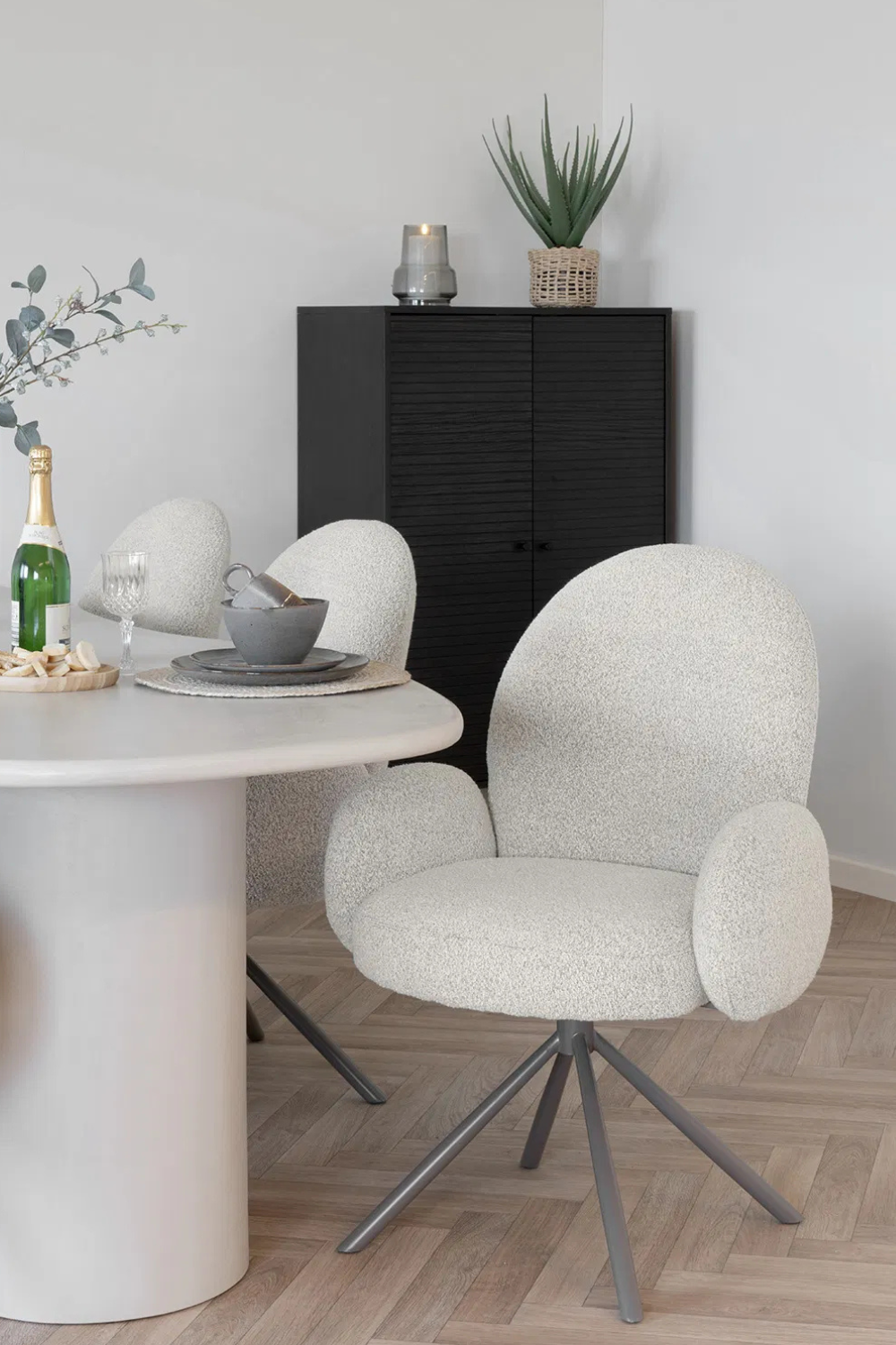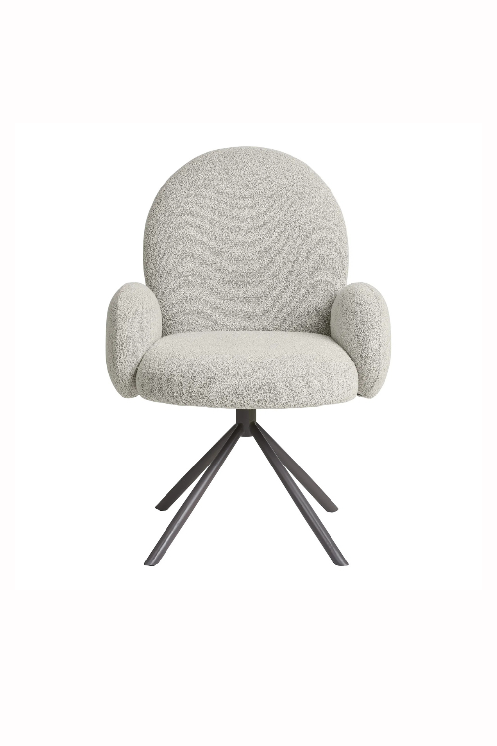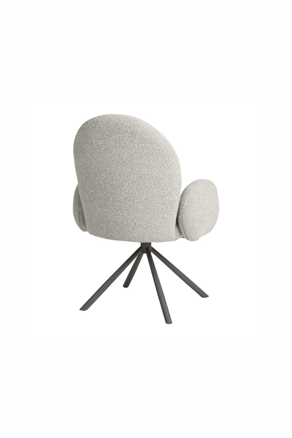 Stilren matstol i bouclé i sandfärg som förenar mjuk komfort med modern design. Stabil underrede och en sits i mjuka former gör att den passar både vid matplatsen eller som kontorsstol.