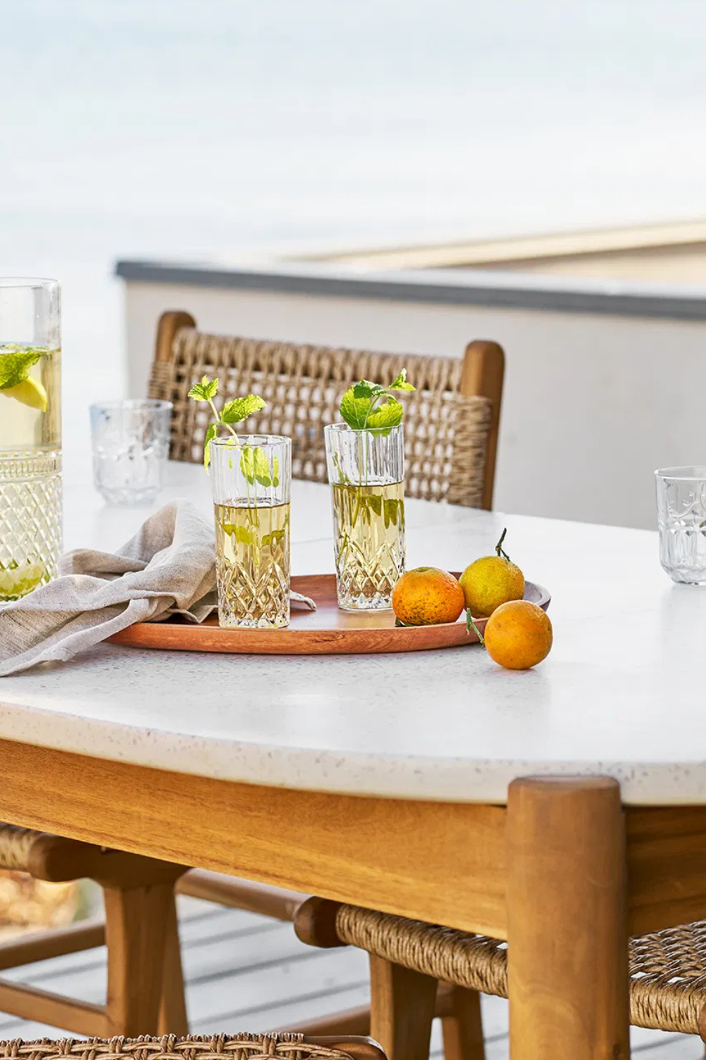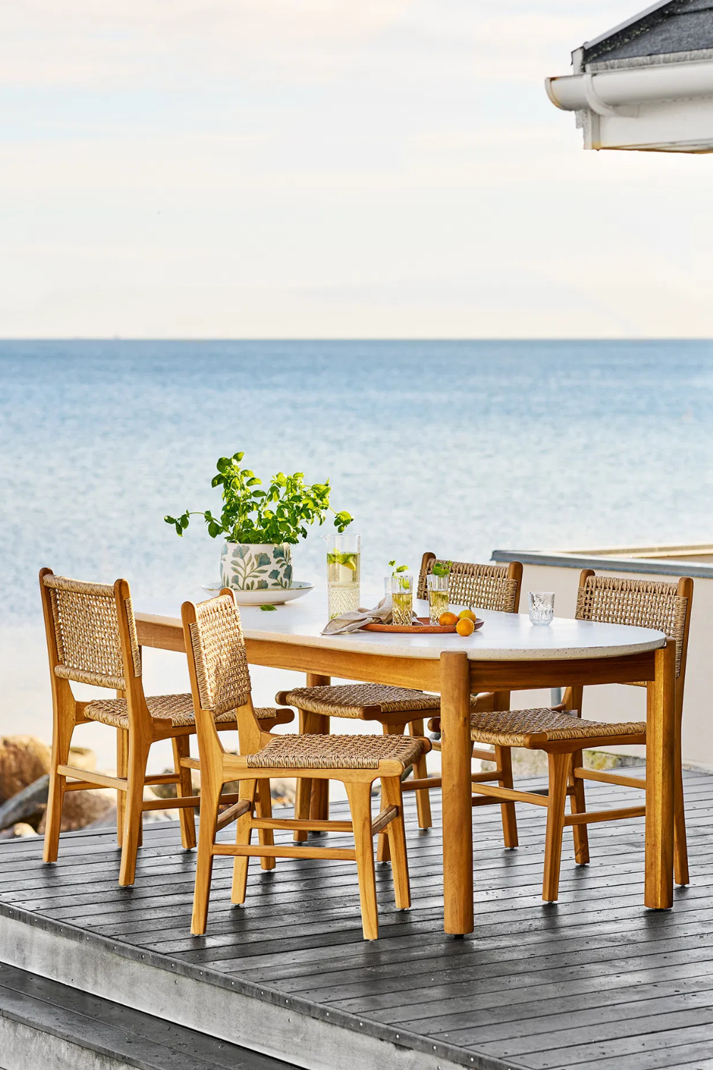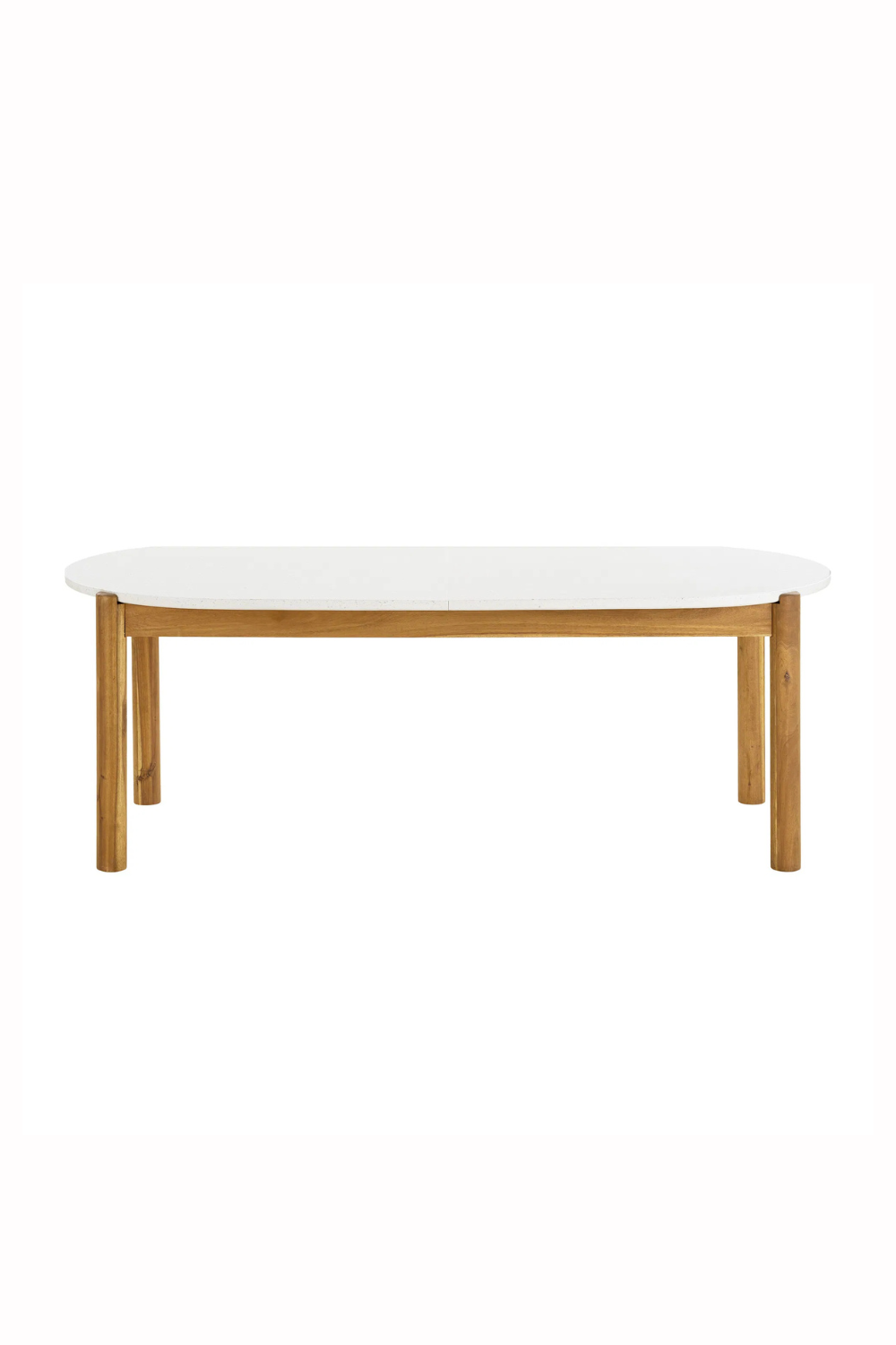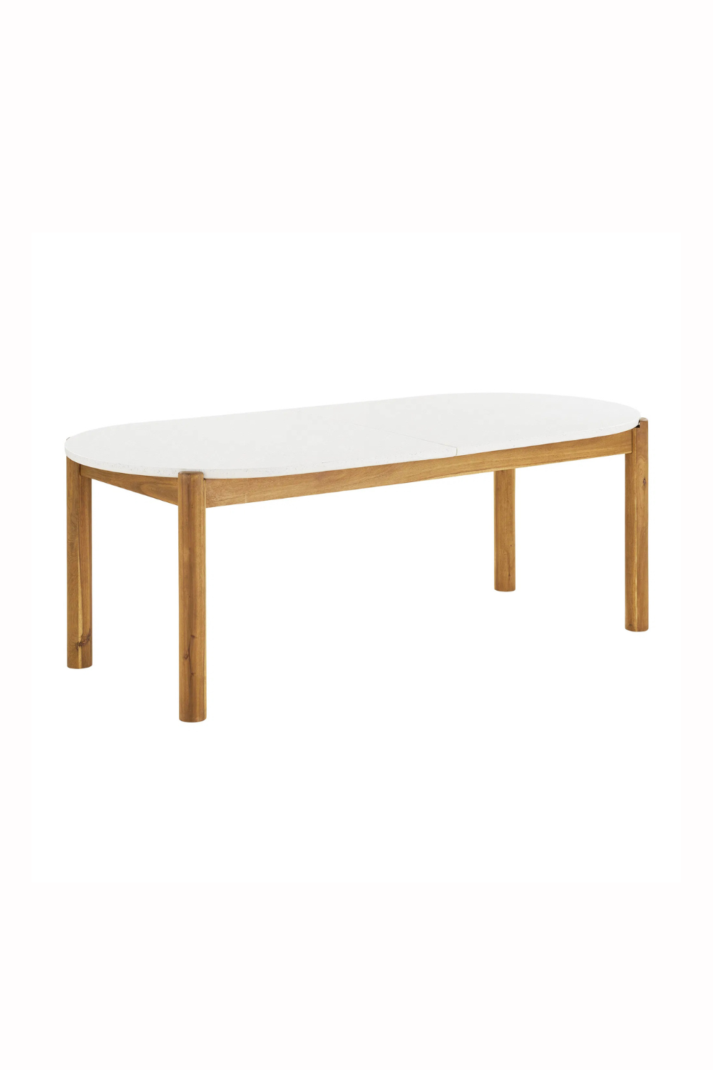 Matbord för utomhusbruk med stomme i naturlig akacia och bordsskiva i vitt terrazzo. Kombinationen av material skapar en varm och modern känsla – perfekt för middagar på terrass eller i trädgård.