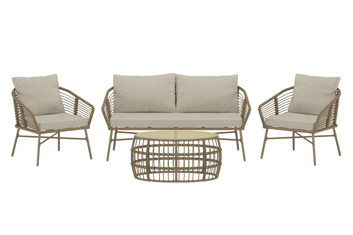 Skapa en härlig samlingspunkt på din altan, balkong eller trädgård med soffgruppen Lipari. Gruppen består av en rymlig soffa, två bekväma fåtöljer och ett elegant bord som tillsammans bjuder in till både avkoppling och umgänge. De mjuka dynorna ger hög komfort och den luftiga designen skapar en lätt och modern känsla som passar lika bra för sommarens lata dagar som för festliga kvällar med vänner.Med Lipari soffgrupp får du en perfekt kombination av stil och komfort som snabbt blir hemmets favoritplats utomhus.