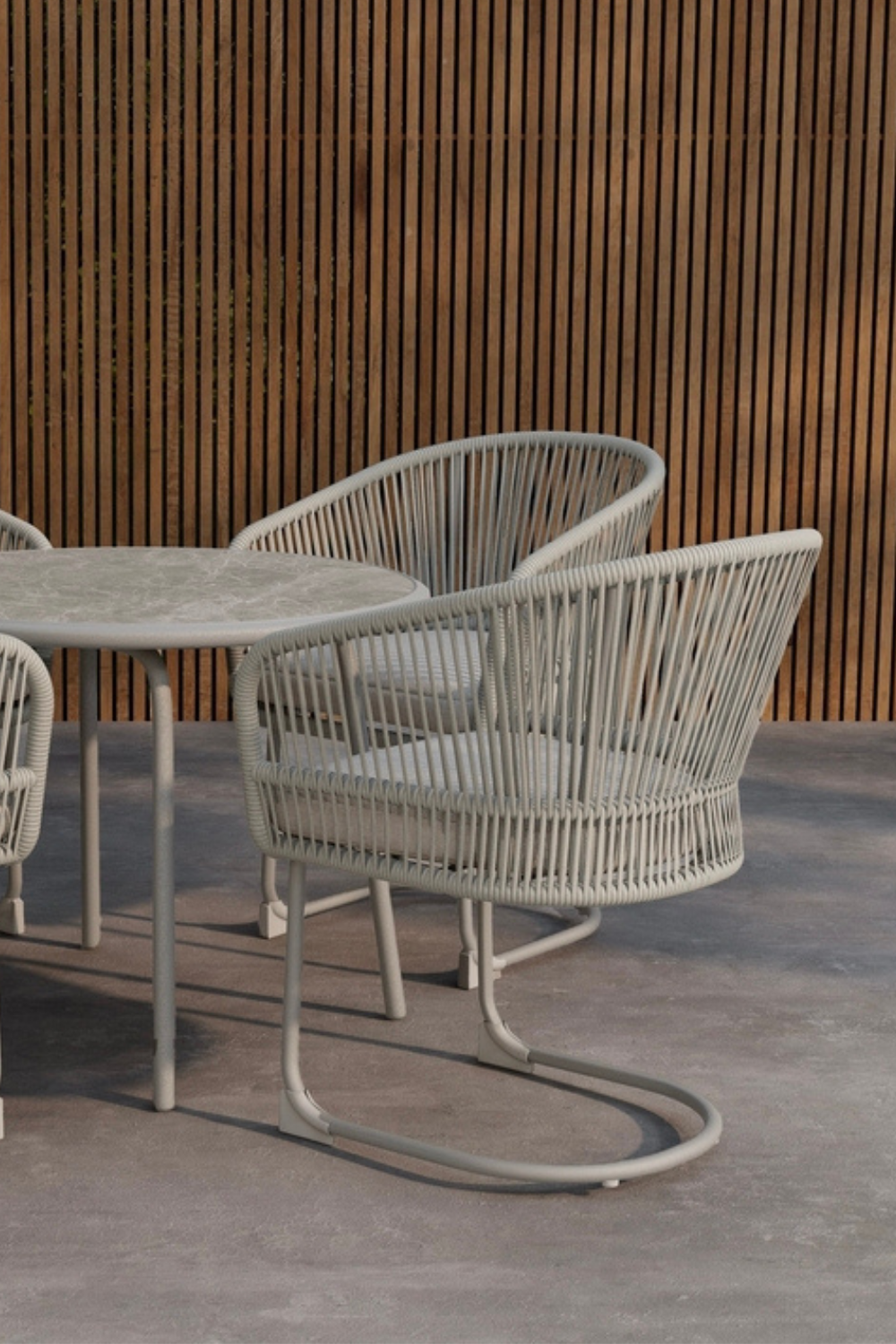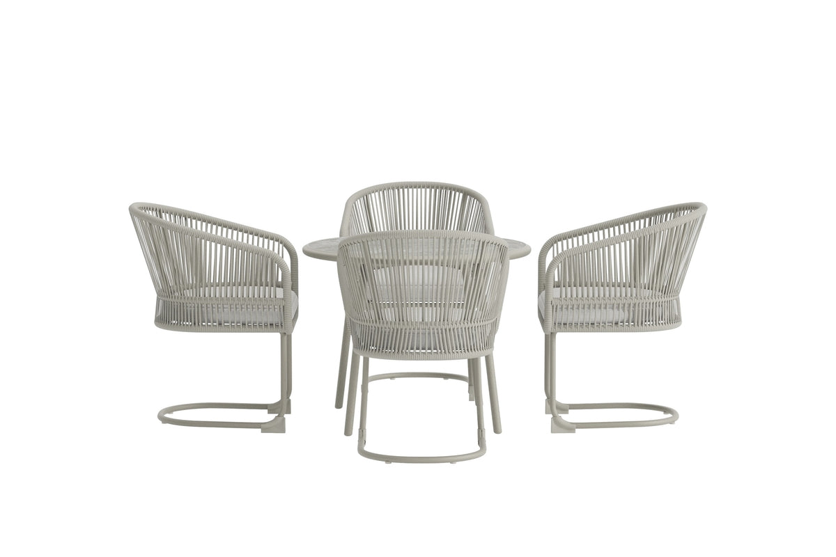 Tilos är en elegant rund matgrupp som kombinerar modern form med inbjudande komfort. Den runda bordsskivan skapar en naturlig samlingspunkt och gör att alla runt bordet kan umgås på samma villkor. De medföljande stolarna har en omslutande design med mjuka dynor som ger hög sittkomfort, perfekt för långa middagar och avkopplande stunder utomhus.Med Tilos matgrupp får du en harmonisk balans mellan stil och funktion – en plats där familj och vänner gärna samlas för att njuta av både vardag och fest.