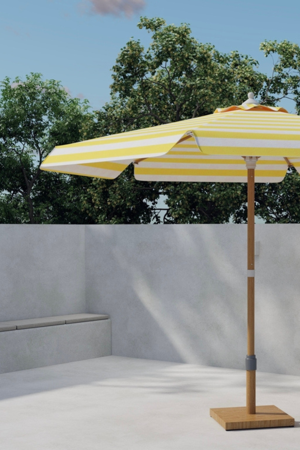 Cerox parasoll är ett fräscht och somrigt solskydd som sprider både glädje och skugga på uteplatsen. Med sitt randiga tyg i gult och vitt får parasollet en livlig och solig karaktär som lyfter hela miljön, oavsett om det är på balkongen, vid poolen eller i trädgården. Det ger svalkande skydd under varma dagar samtidigt som det blir en stilfull detalj i din utomhusinredning. Cerox är det perfekta valet för dig som vill kombinera funktion med en somrig och lekfull design.