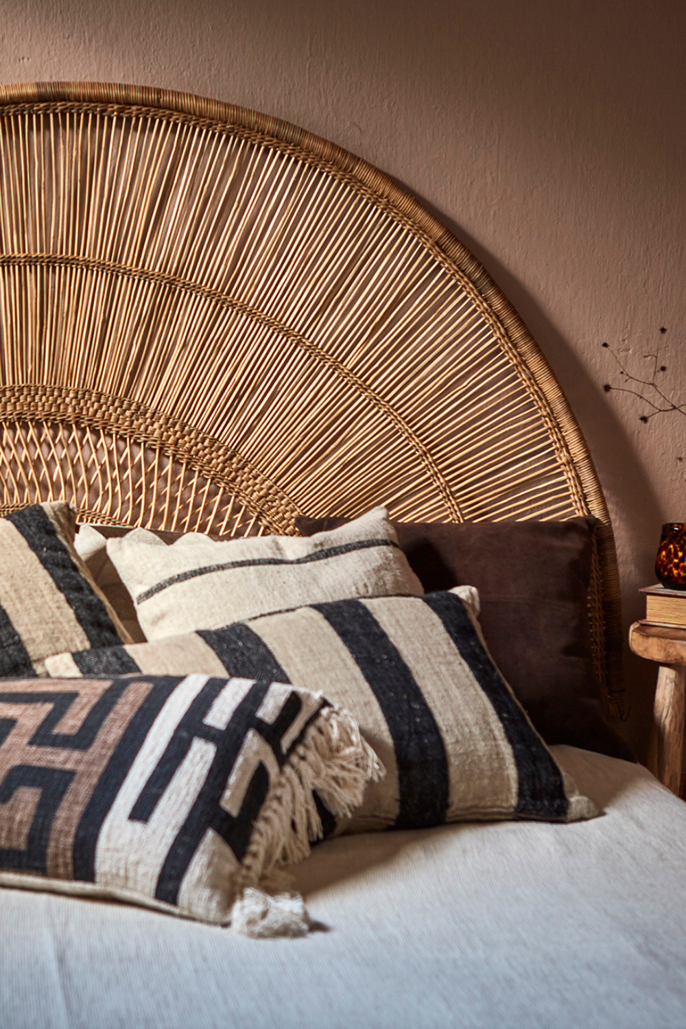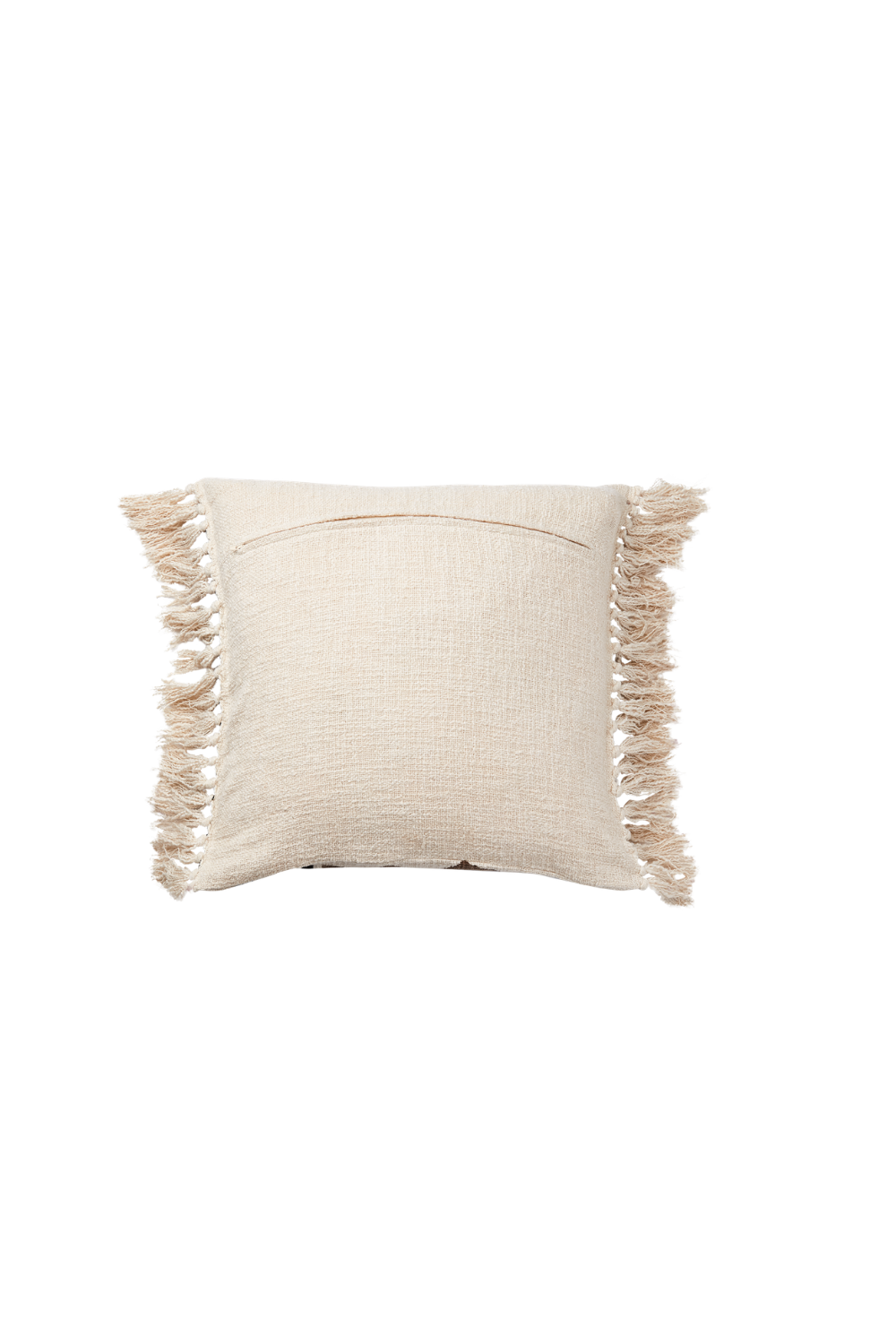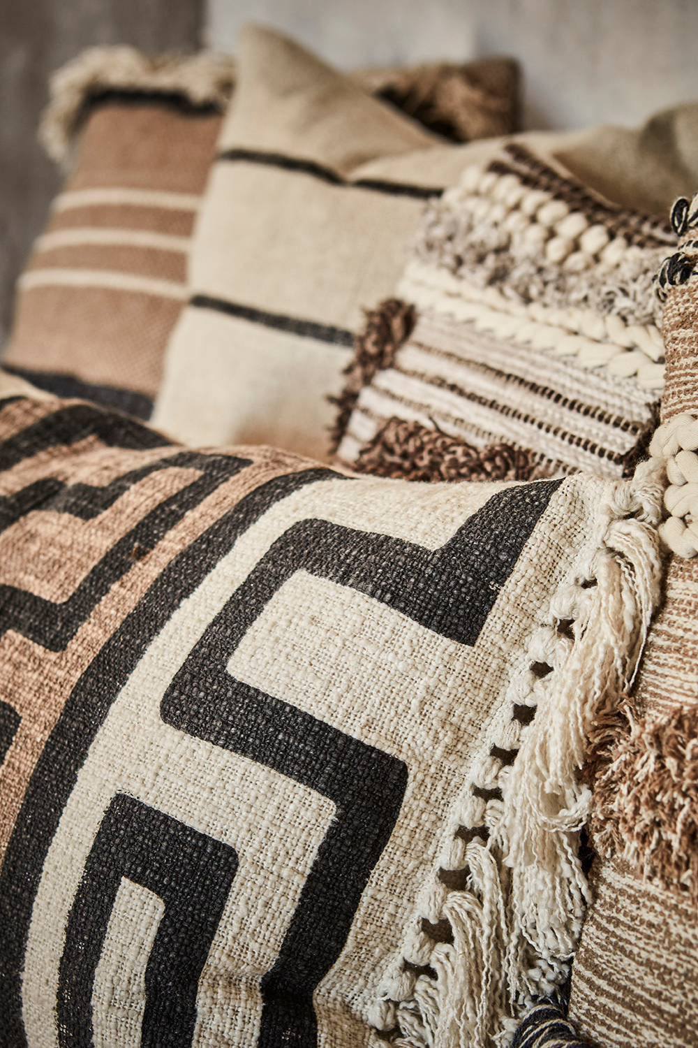 Dekorativ kudde med grafiskt mönster i jordnära toner av svart, brunt och naturvitt. Vacker vävd struktur och fransar på kortsidorna ger en mjuk, bohemisk känsla – perfekt som accent i soffa eller säng.
