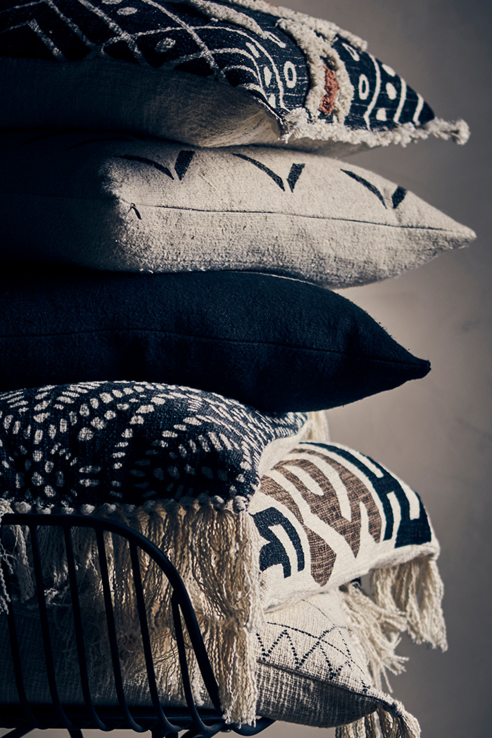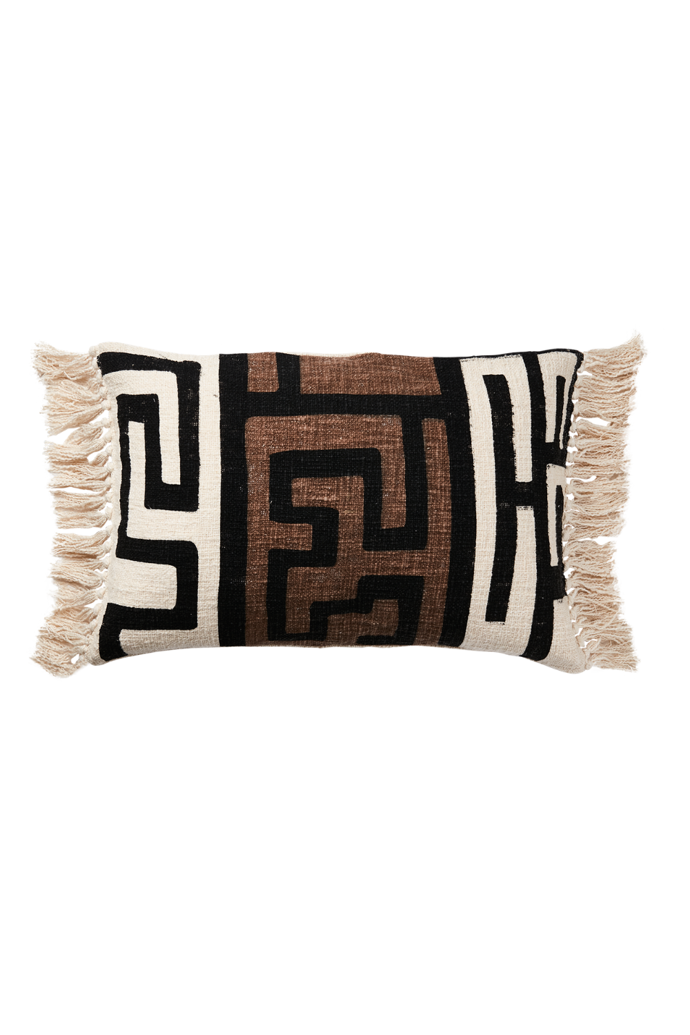 Dekorativ kudde med grafiskt mönster i jordnära toner av svart, brunt och naturvitt. Vacker vävd struktur och fransar på kortsidorna ger en mjuk, bohemisk känsla – perfekt som accent i soffa eller säng.