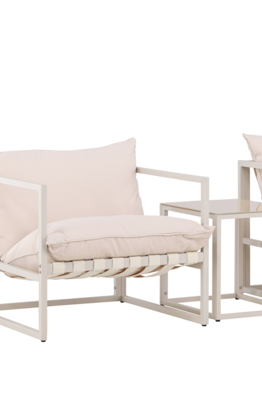 Loungegruppen Messina är det perfekta valet för dig som vill skapa en stilfull och inbjudande atmosfär på uteplatsen. I en trendig beige färg ger Messina ett modernt och elegant uttryck som smälter in i alla utomhusmiljöer. Gruppen består av två bekväma fåtöljer och ett stilrent glasbord – den perfekta kombinationen för avslappnade stunder i solen. Fåtöljerna är tillverkade i robust stål och kommer med mjuka dynor i slitstark polyester, som ger en behaglig sittupplevelse. Bordet är designat med en glasskiva som vilar på en stålram, vilket skapar en snygg och hållbar yta. Placera Messina på verandan eller altanen och njut av avkopplande stunder i sällskap med stil och komfort.