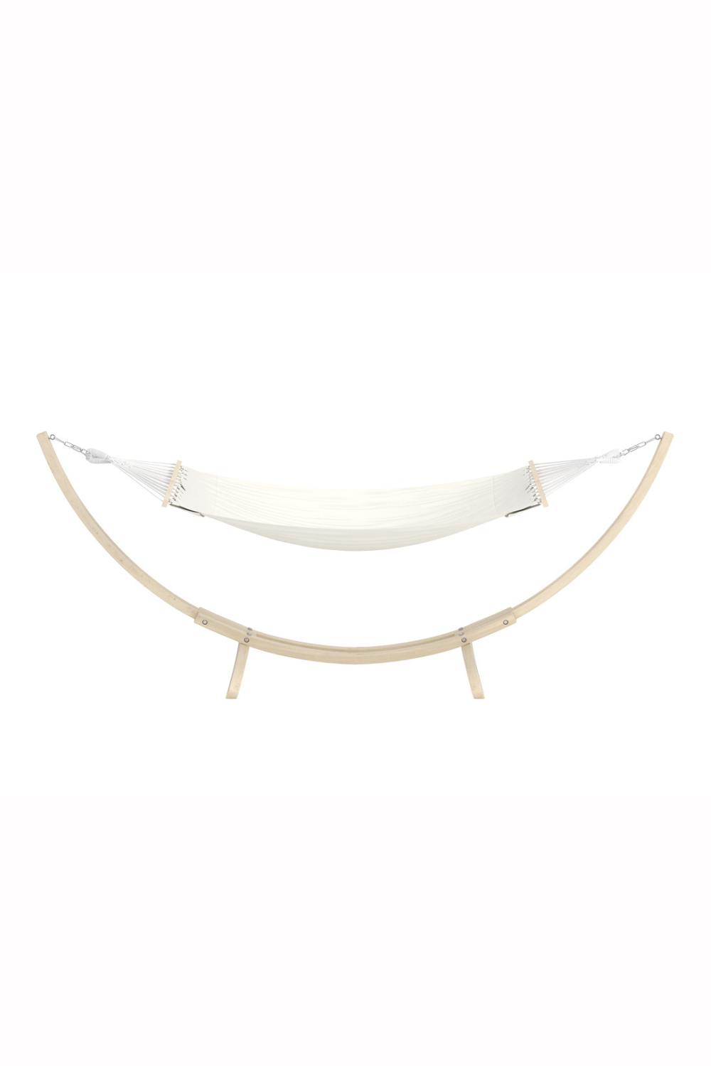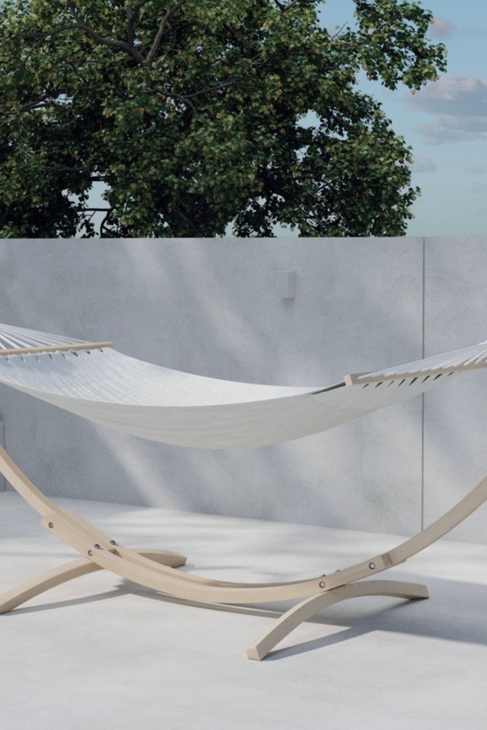 Hedvig hammock är den ultimata platsen för avkoppling utomhus. Med sin eleganta träställning och mjuka, ljusa hängmatta bjuder den in till stilla stunder i solen eller en skön vilopaus i skuggan. Den svängda basen ger hammocken en luftig och harmonisk känsla, samtidigt som den blir en vacker detalj på uteplatsen eller i trädgården. Hedvig är perfekt för dig som vill kombinera komfort med stil – en hammock som gör sommardagarna ännu lite härligare.