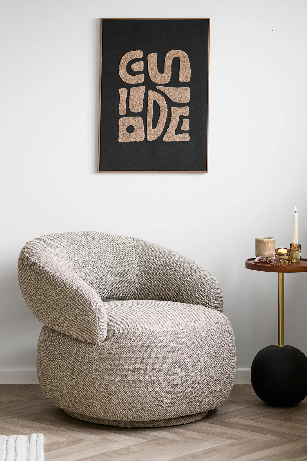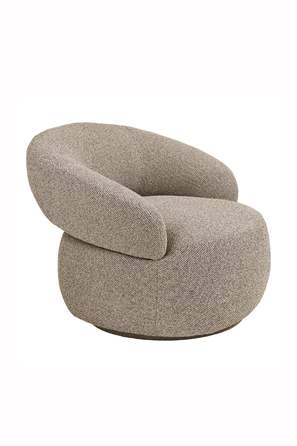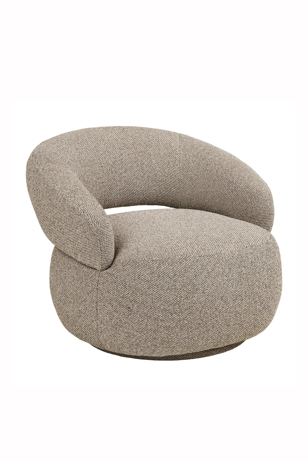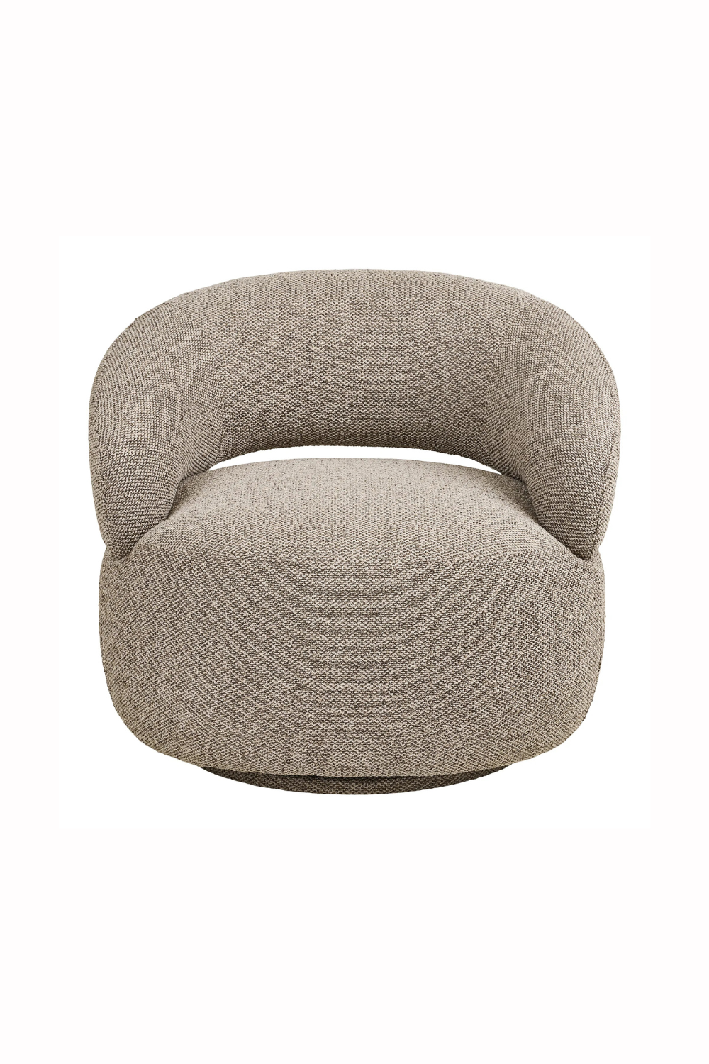 En mjuk och inbjudande loungefåtölj i sandfärgad textil med rundade former. En stilren design som skapar lugn och komfort i rummet.
