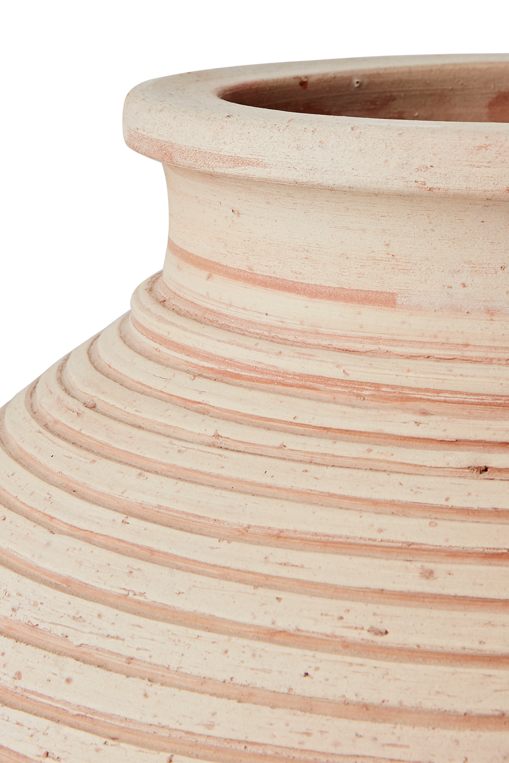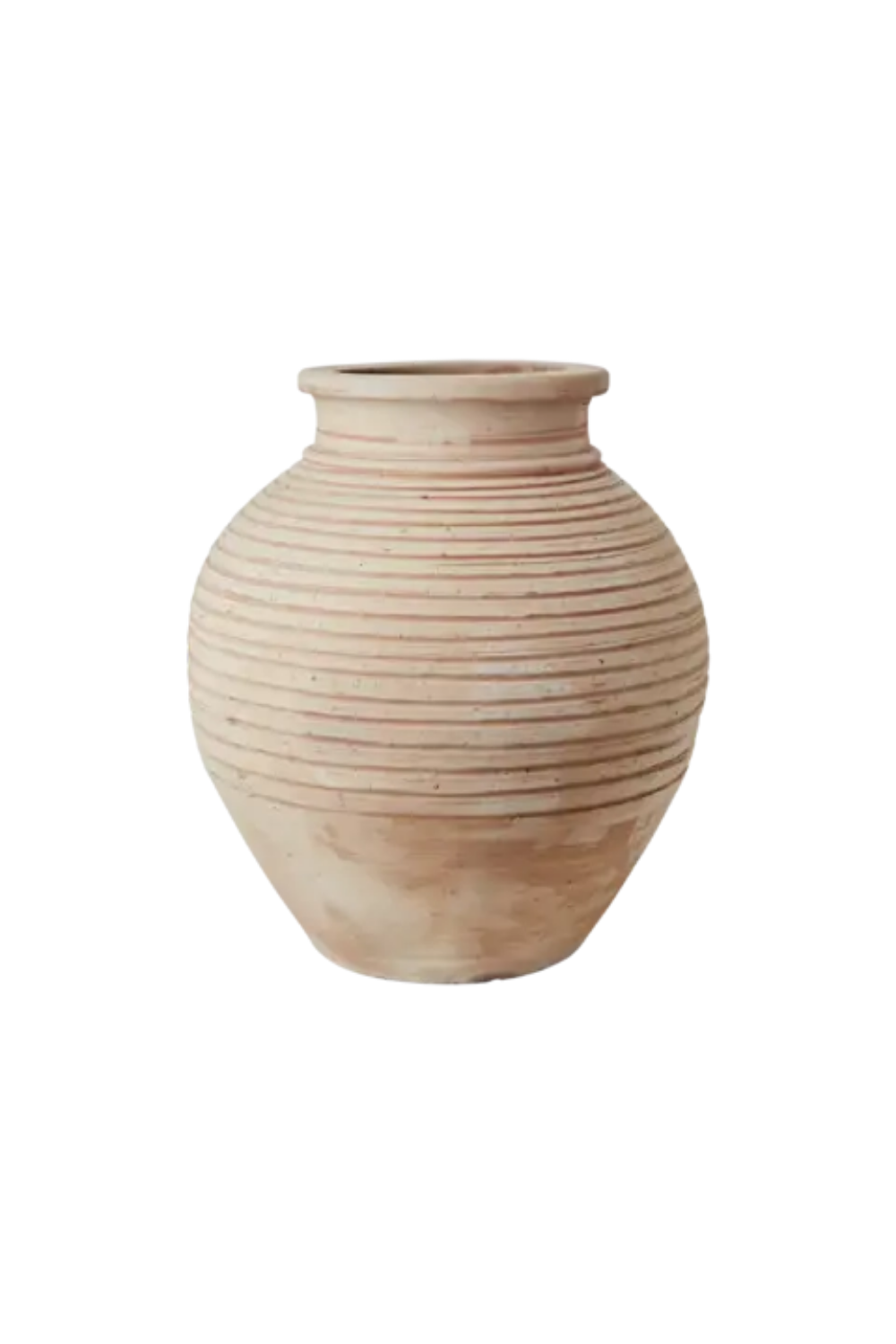Dekorativ handgjord urna i naturfärgad lera med mjukt rundad form och smal hals. Den räfflade ytan ger ett levande, hantverksmässigt uttryck och varje exemplar är unikt – färg, form och storlek kan variera. Tillverkad i ett poröst material, använd därför vattentäta fat för att undvika fläckar. Färg, form och storlek kan variera.