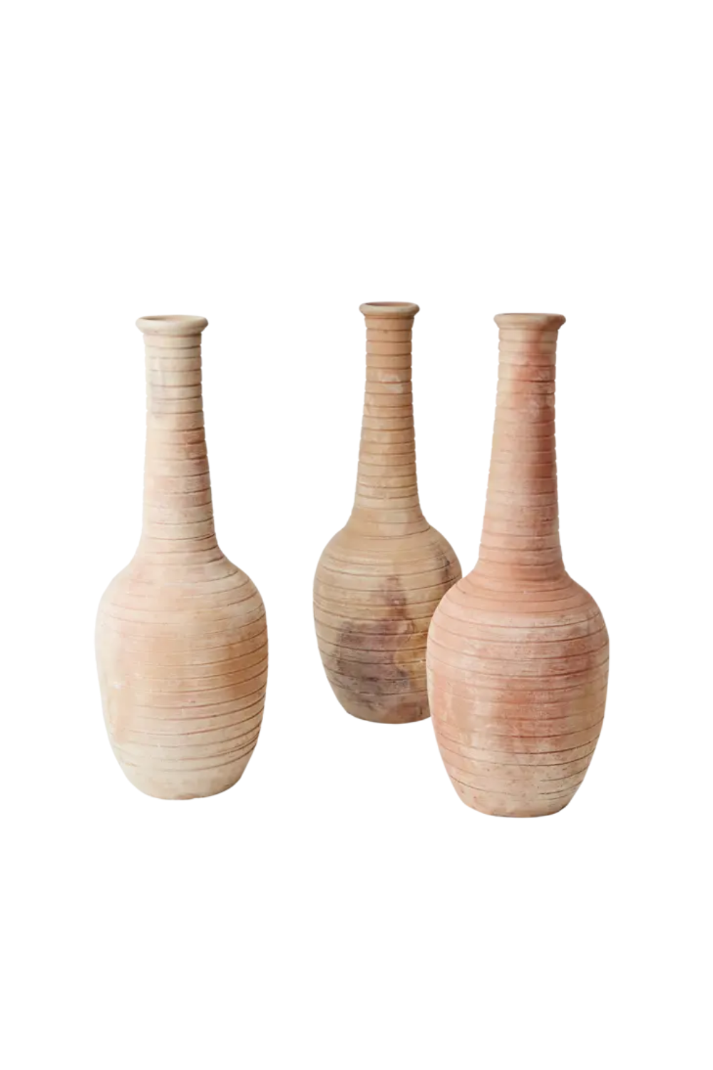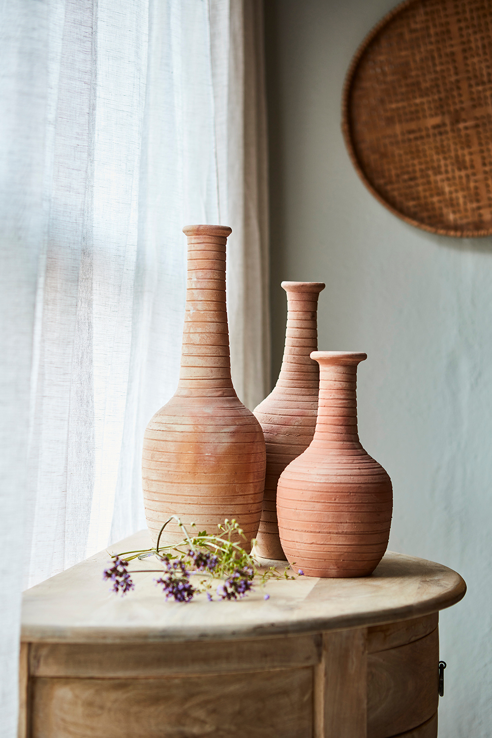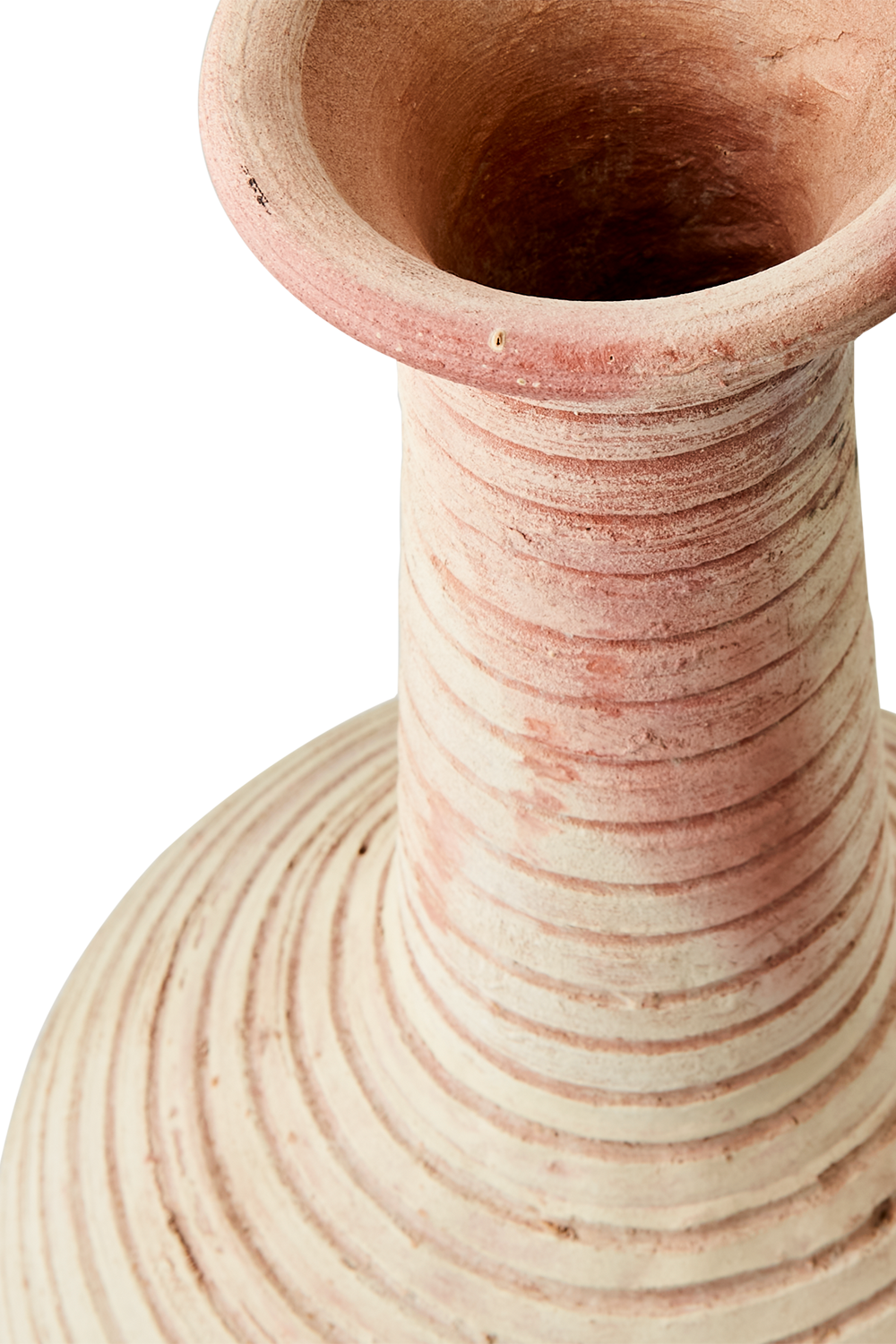 Dekorativ handgjord vas i naturfärgad lera med mjukt rundad form och smal hals. Den räfflade ytan ger ett levande, hantverksmässigt uttryck och varje exemplar är unikt – färg, form och storlek kan variera. Tillverkad i ett poröst material, använd därför vattentäta fat för att undvika fläckar.